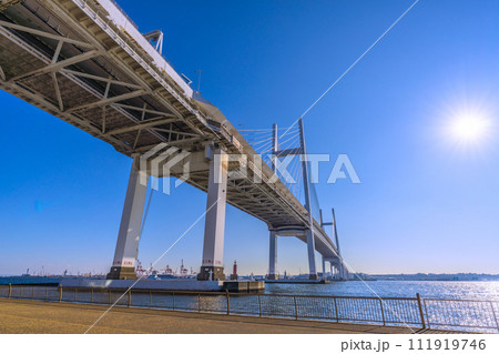 日本の横浜都市景観 大黒ふ頭から横浜ベイブリッジのスカイウォークや展望ラウンジなどを望む