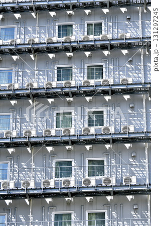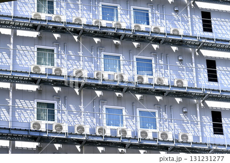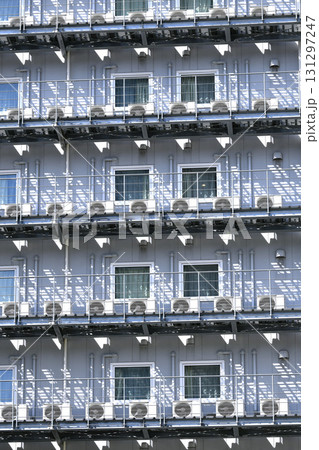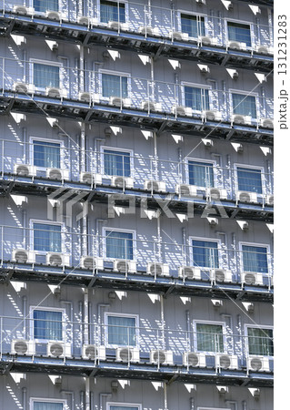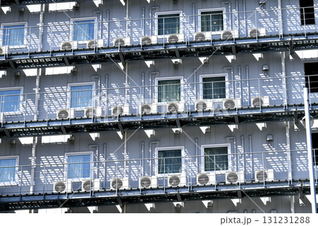日本の横浜都市景観 ビジネスホテルの外に並ぶ室外機などを望む