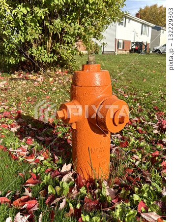 紅葉の中に立つオレンジ色の消火栓/Orange Fire Hydrant among Autumn