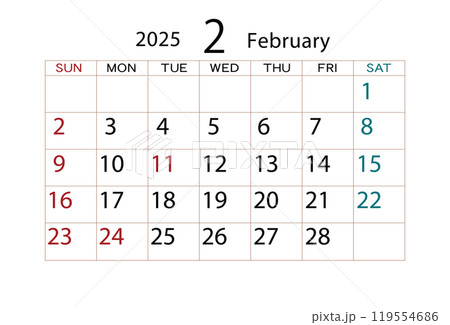 カレンダー、2月、英字入り