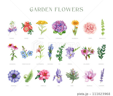 Garden flowers vintage style watercolor painted big set. Hand drawn different garden flowers painted collection. Various floral vintage style botanical element set. White background