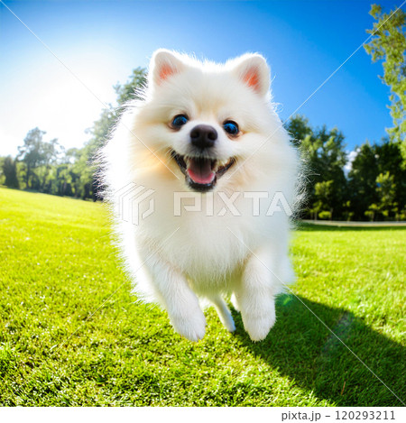 魚眼レンズで撮影した可愛い白いポメラニアンの子犬 青空の公園の背景