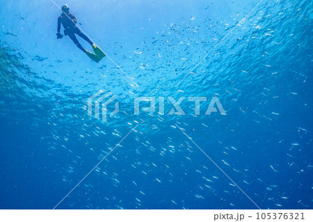 南伊豆ヒリゾ浜のキビナゴの大群と水面のダイバーさん
