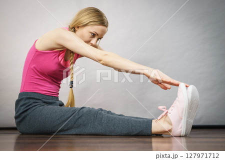 Woman Stretching in Gym. A athletic woman wearing a purple sports outfit is stretching her legs in a gym.