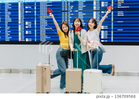 海外旅行へ出掛ける空港の女性3人組 「撮影協力:関西国際空港(KIX)」
