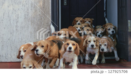 Beagle dogs rushing out of a house's door create a lively and energetic scene, showcasing their playful nature and excitement as they form a dynamic pack in motion