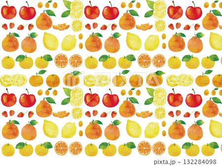 水彩風 冬の柑橘類(リンゴ・イチゴ・ユズ・ミカン・レモン・デコポン・キンカン) パターン