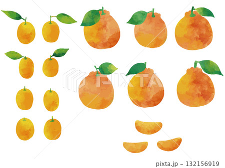 水彩風 デコポンと金柑のイラストセット(葉っぱ付きあり)