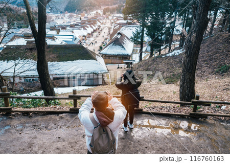 tourist sightseeing Ouchi Juku ancient farmer house village with snow in winter, Traveler travel in Shimogo town, Minamiaizu, Fukushima Prefecture, Tohoku Region, Japan. Landmark and vacation
