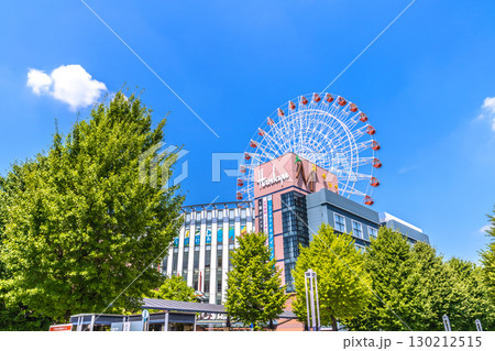 日本の横浜都市景観 5月。センター北駅前・新緑や青空に映える観覧車、都築阪急などを望む