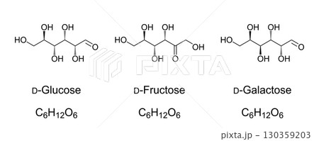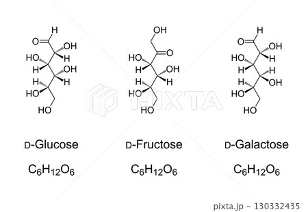 Glucose, fructose, and galactose, chemical formulas and molecular structures. The three most important sugar compounds in human metabolism. Monosaccharides. Natta projection of the D-configurations.