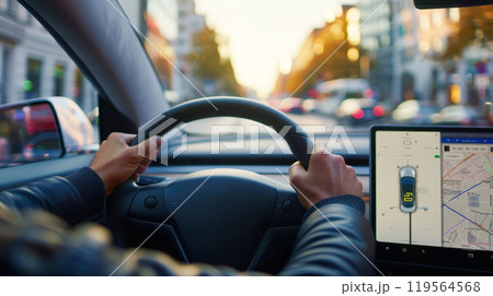 Hands on steering wheel in modern car with navigation screen display at dusk
