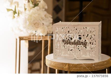 Elegant White Wedding Card Box with Ornate Laser Cut Design Placed on Gold-Rimmed Marble Table Near Floral Arrangement