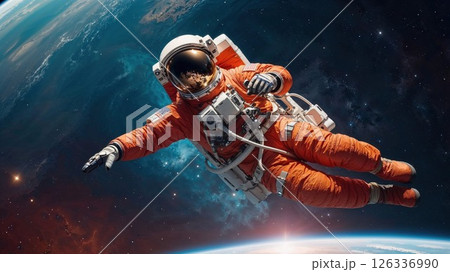 Astronaut in vivid orange suit drifts weightlessly in orbit above Earth, set against a backdrop of stars and deep space symbolizing exploration, science, and infinite discovery