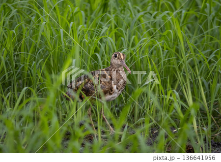 Common snipe sitting on the ground and hiding in a vegetation of wetland