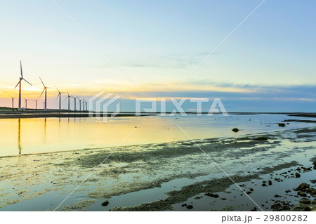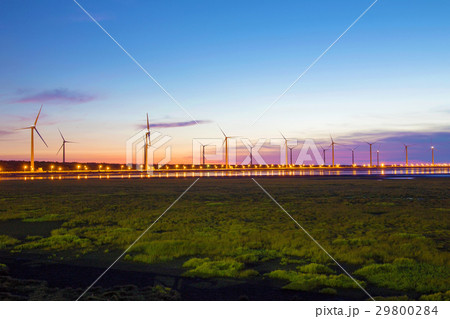sunset view of Gaomei wetlands landscape and the wind power plant in Taichung, Taiwan. energy systems and renewable energy.