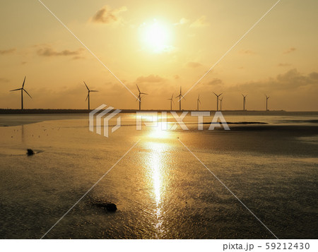 sunset view of Gaomei wetlands landscape and the wind power plant in Taichung, Taiwan. energy systems and renewable energy.