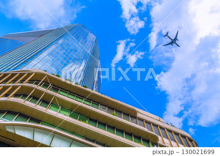 日本の東京都市景観 航空機通過…猛烈な暑さ、発達した雲が高輪ゲートウェイシティ上空に…=8月21日