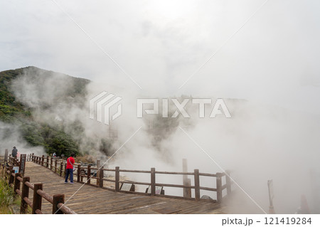 長崎県雲仙市 雲仙地獄の湯煙の立ち込める遊歩道を歩く観光客