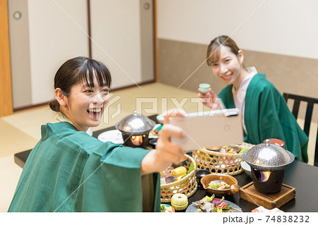 いただきますをして旅館の夕飯を食べる女性客 女子旅 GoToトラベルイメージ