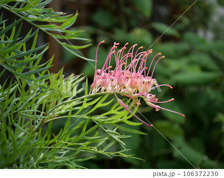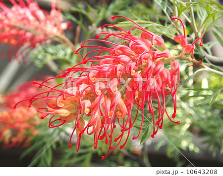 赤い花が咲いた常緑低木のグレビレア・ロビンゴードン