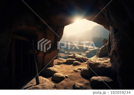 Empty tomb with crucifix at dawn. Resurrection concept made with generative AI