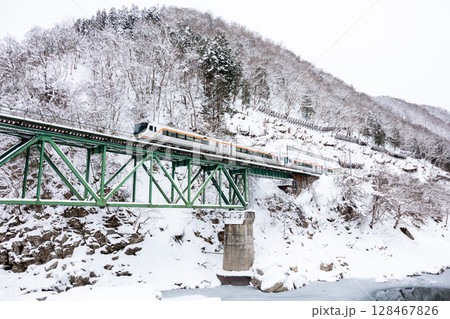 【高山本線】雪景色の宮川を渡る特急ひだ