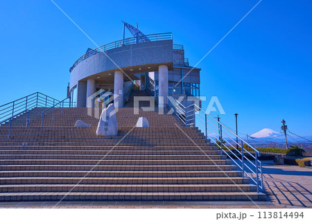 快晴の神奈川県平塚市の湘南平新展望台を見上げる