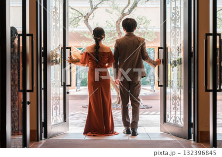 披露宴,二次会,結婚式のカラードレスで登場する新郎新婦,ドレスアップした夫婦