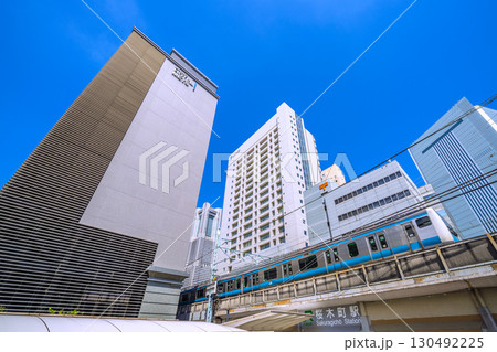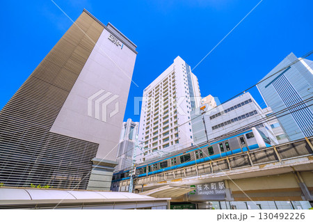 日本の横浜都市景観 電車や桜木町駅前複合ビル・JR東日本ホテルメッツ横浜桜木町などを望む=13日