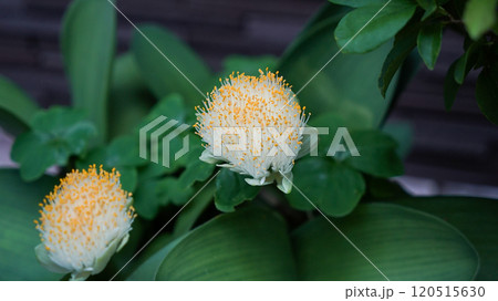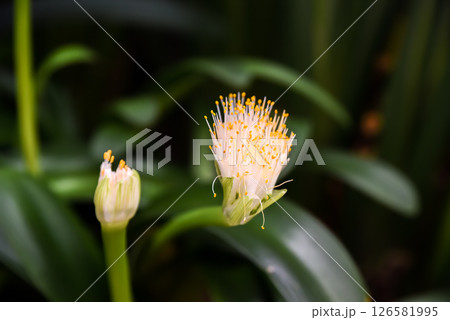 White-flowered Haemanthus in bloom, with thick green leaves and unique brush-like petals, a tropical bulbous plant from the Amaryllidaceae family.
