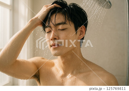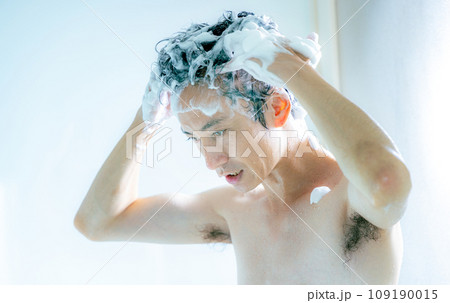 頭皮、髪をマッサージしているマッチョな日本人男性