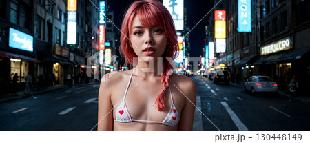 マイクロビキニで街を歩くピンクの髪の美女 Pink-haired beauty walking ar