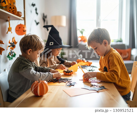 横からの視点で、集中した表情でハロウィン工作に取り組む子供たち