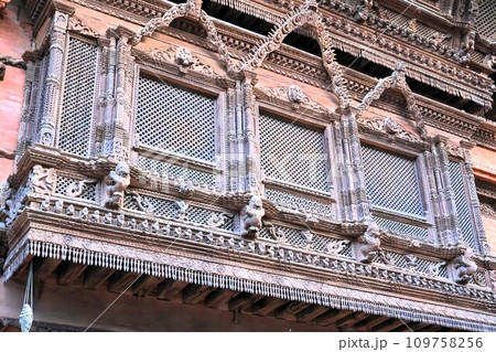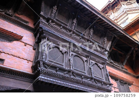 ネワール建築の特色のひとつである木彫が施された出窓