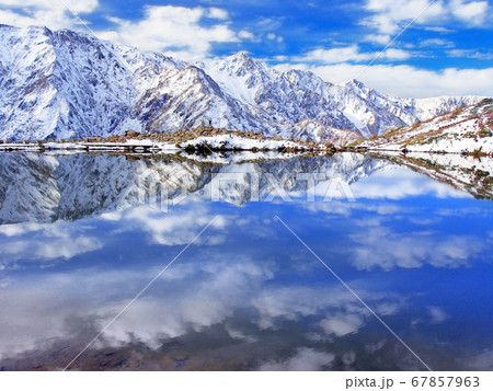 初冠雪の白馬連峰を映す八方池の水鏡