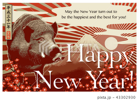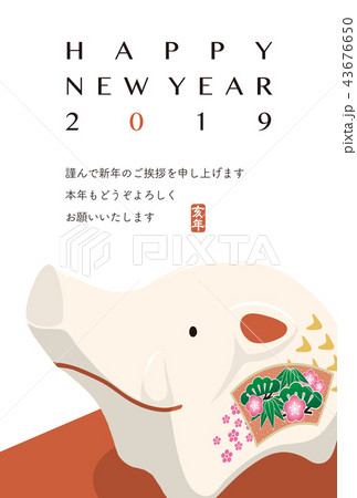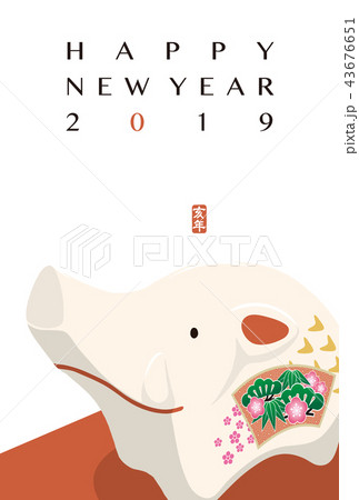 2019年賀状「亥の置きもの」ハッピーニューイヤー 日本語添え書き付き
