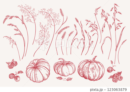 Set of hand drawn colorful sesame pods, seeds, flowers and leaves sketch style