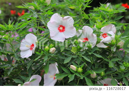 庭園に咲く赤と白のタイタンビカスの花