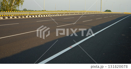 Low Angle View of Empty Modern Highway with Safety Barrier and Road Lines