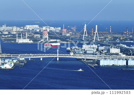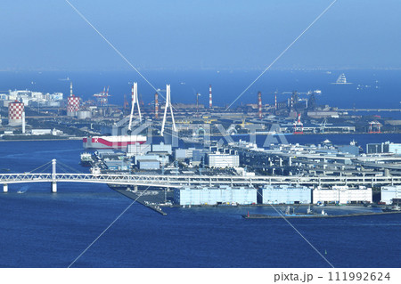 日本の横浜都市景観 大黒ふ頭(右)を離れた自動車船VICTORIA HIGHWAYや扇島などを望む