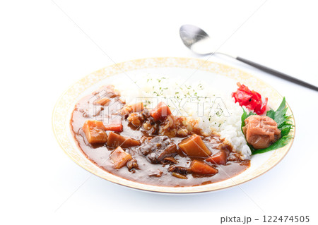 カレーライス ( 白背景 )梅干しと福神漬けを添えて
