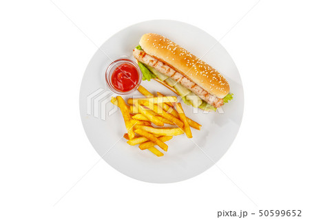 Hot dog with sausage and french fries isolated white
