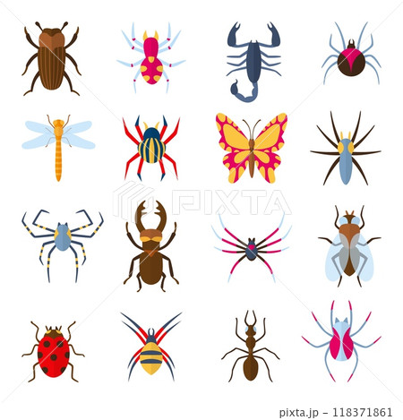 Flat insects. Spiders butterfly bugs fly dragonfly scorpio ladybug icons. Vibrant dangerous insects, seasonal scary animals, neoteric vector collection