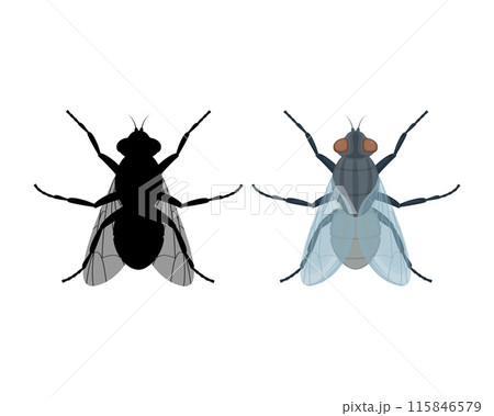 Fly. A cartoon-style image of a fly. The silhouette of a fly. The fly is a view from above. Flying insect, vector illustration