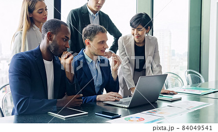 オフィスでパソコンを見ながら企業経営について会議するカジュアルウェアの多国籍の人々