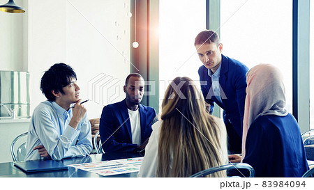 ミーティングする多国籍グループ グローバルビジネス スローモーション サークルショット