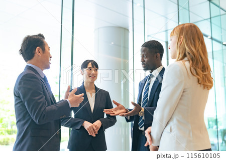 ロビーで会話する多国籍ビジネスパーソンのグループ