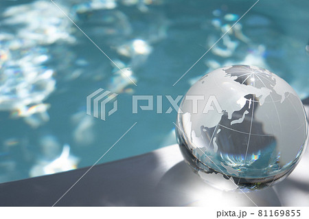 ガラスの地球儀と水面 水の惑星 SDGsなどのイメージ
