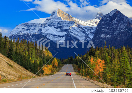 Driving on Icefields Parkway in autumn. Alberta Highway 93. Jasper National Park, Canada.